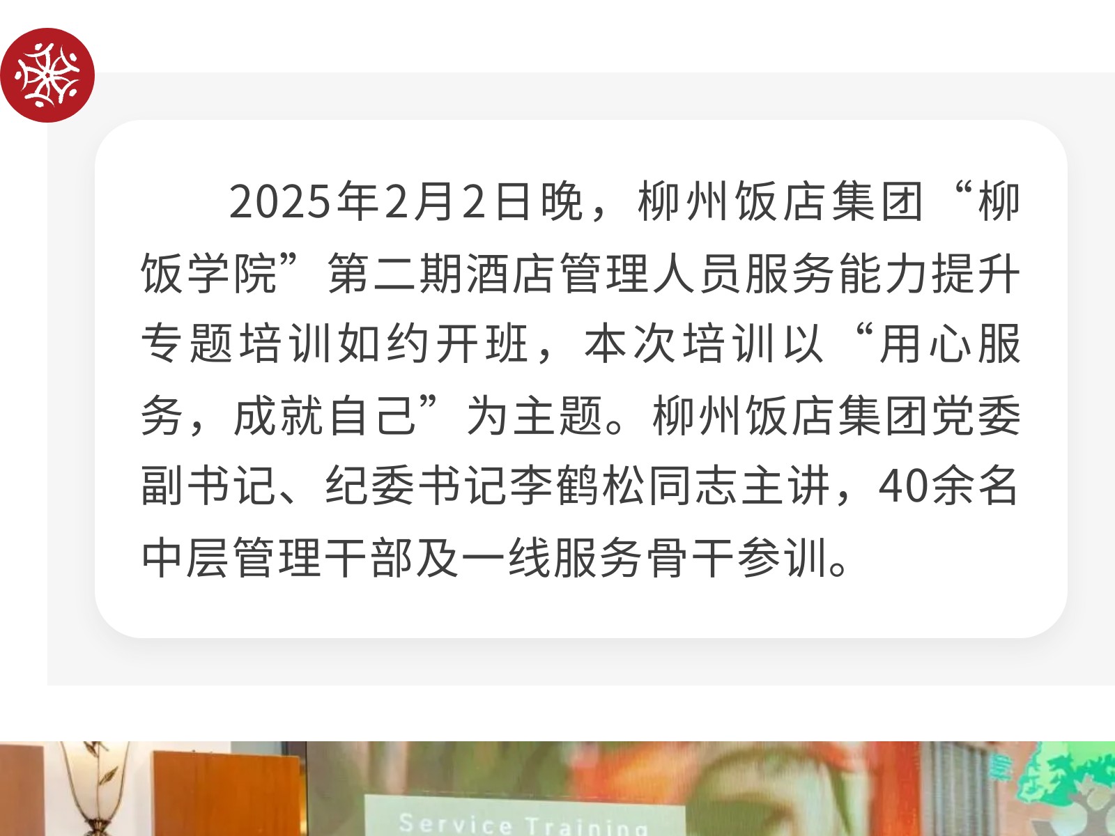 精耕服務(wù)啟新程,聚力向善謀突破——柳州飯店集團(tuán)開展“用心服務(wù),成就自己”酒店管理人員服務(wù)能力提升專題培訓(xùn) 發(fā)布時(shí)間:2026年02月13日 13時(shí)來(lái)源:本站原創(chuàng)瀏覽:30 人次