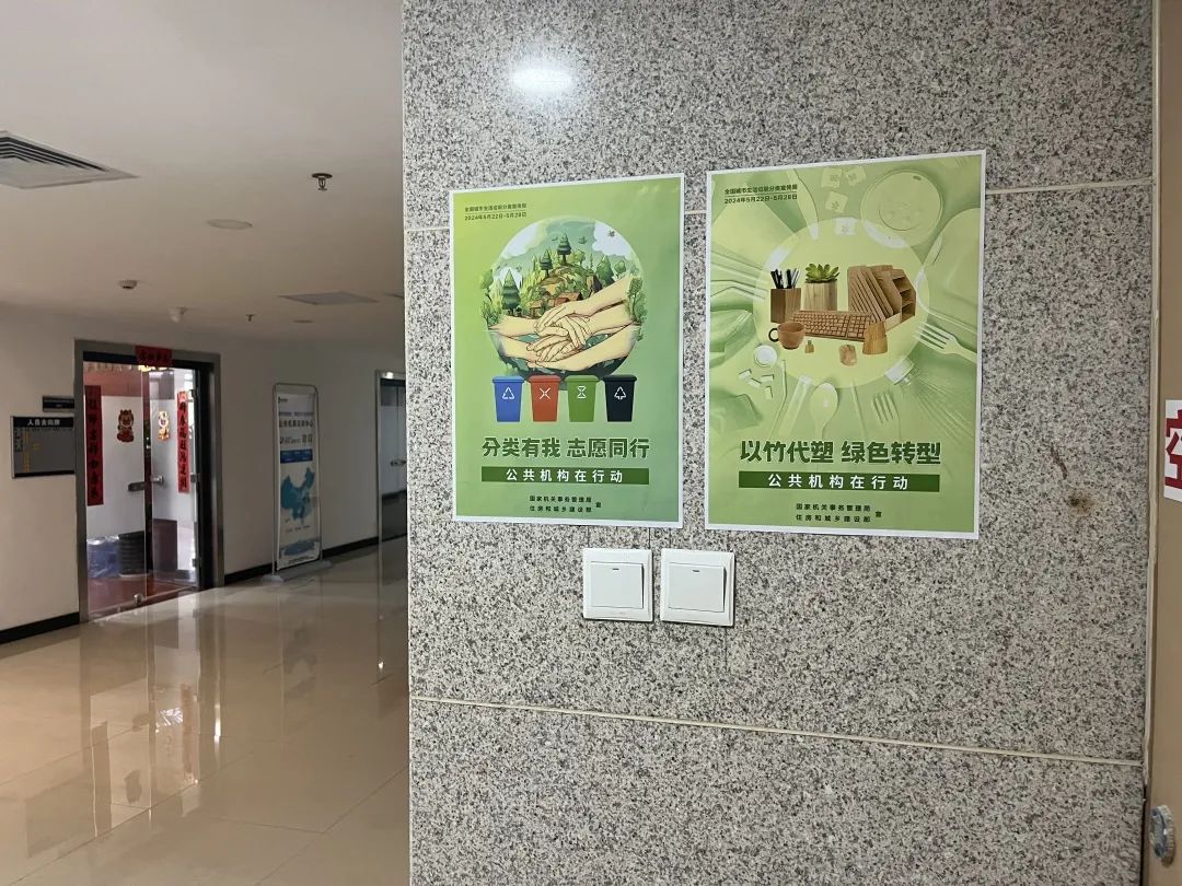 集團總部辦公樓在電梯口、走廊等必經(jīng)公共場所張貼垃圾分類倡導(dǎo)海報、垃圾分類投放指南,潛移默化中增強員工環(huán)保意識。