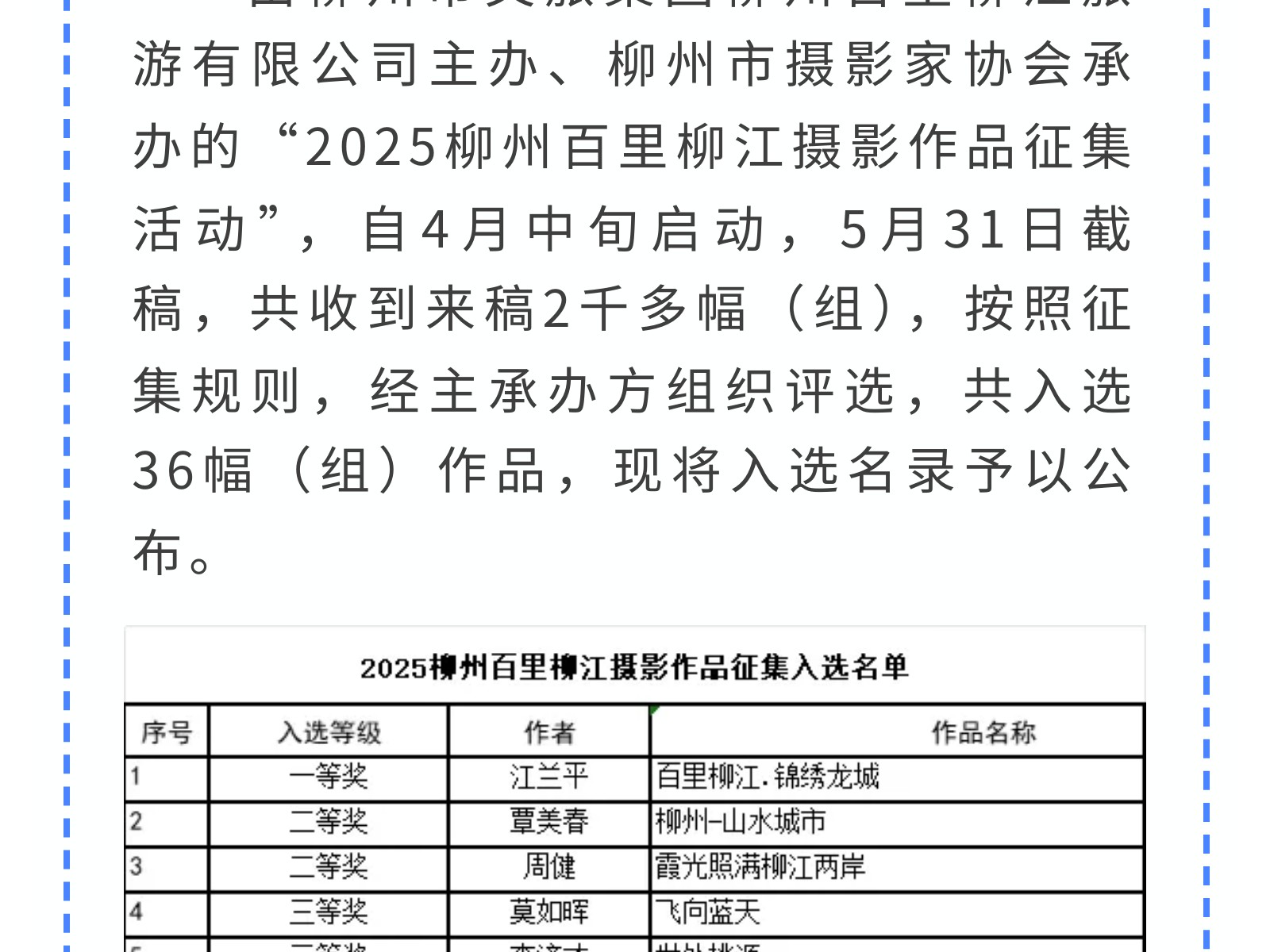 定格最美柳江!首屆“百里柳江”攝影大賽獲獎(jiǎng)作品出爐! 發(fā)布時(shí)間:2025年07月16日 10時(shí)來源:本站原創(chuàng)瀏覽:179 人次