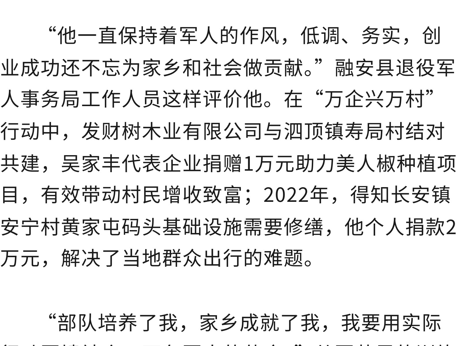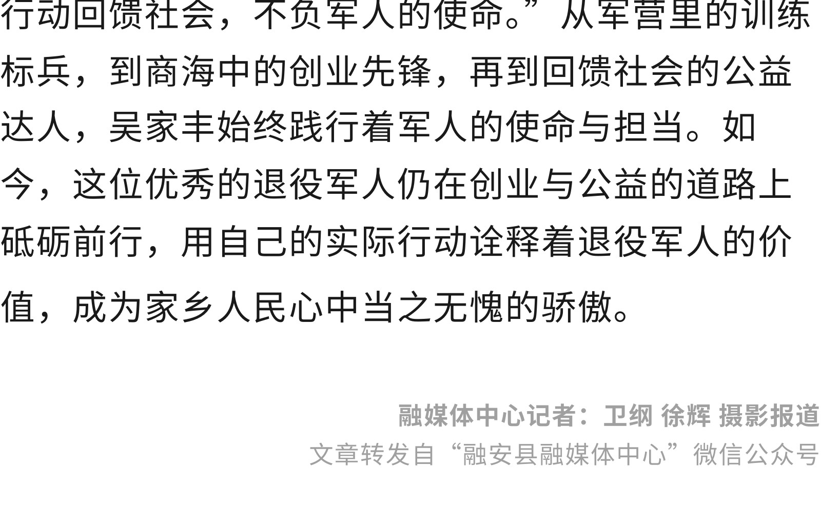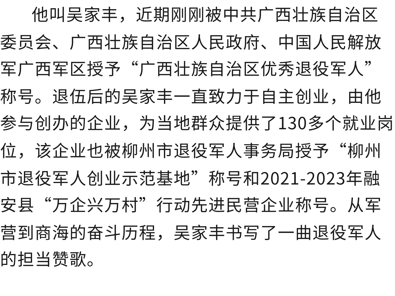 【最美退役軍人】從軍營硬漢到創(chuàng)業(yè)先鋒——記廣西優(yōu)秀退役軍人吳家豐 發(fā)布時間:2025年09月19日 09時來源:本站原創(chuàng)瀏覽:127 人次