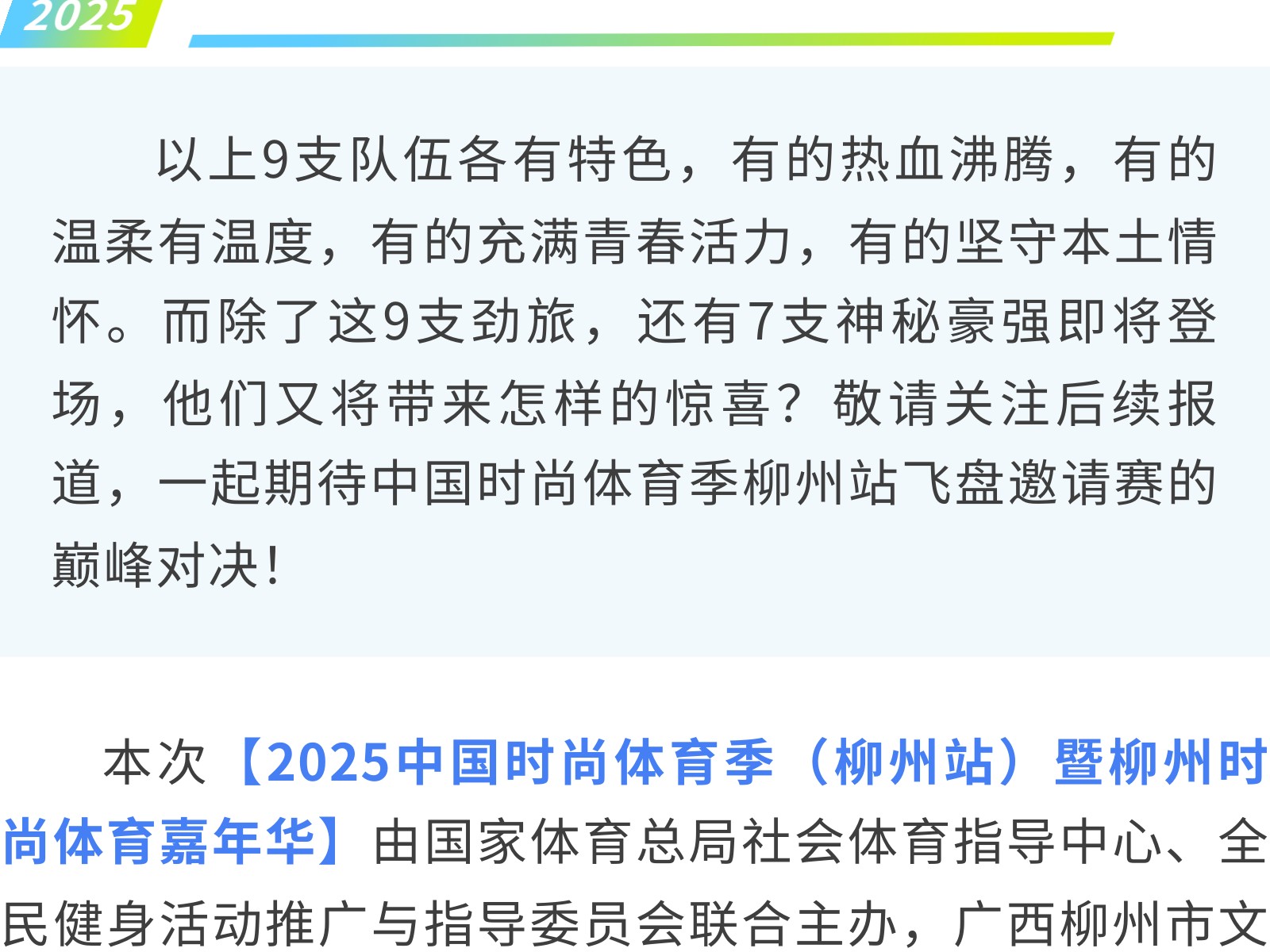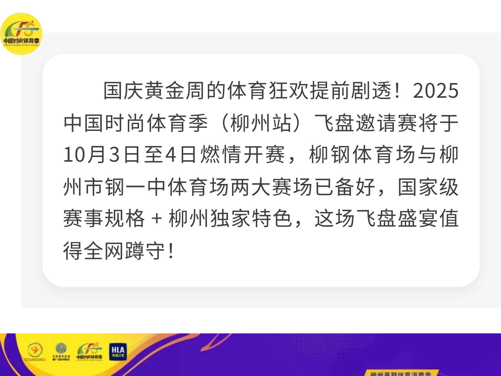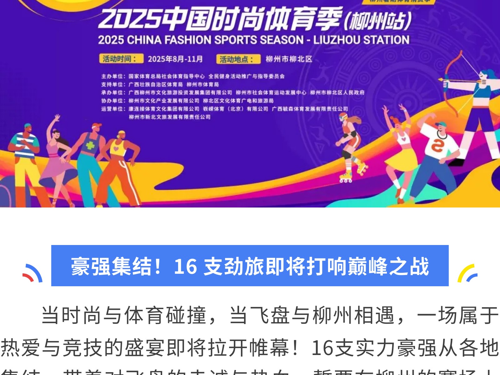 燃動柳州!中國時尚體育季飛盤邀請賽16豪強(qiáng)集結(jié),九支勁旅先睹為快 發(fā)布時間:2025年09月30日 16時來源:本站原創(chuàng)瀏覽:137 人次