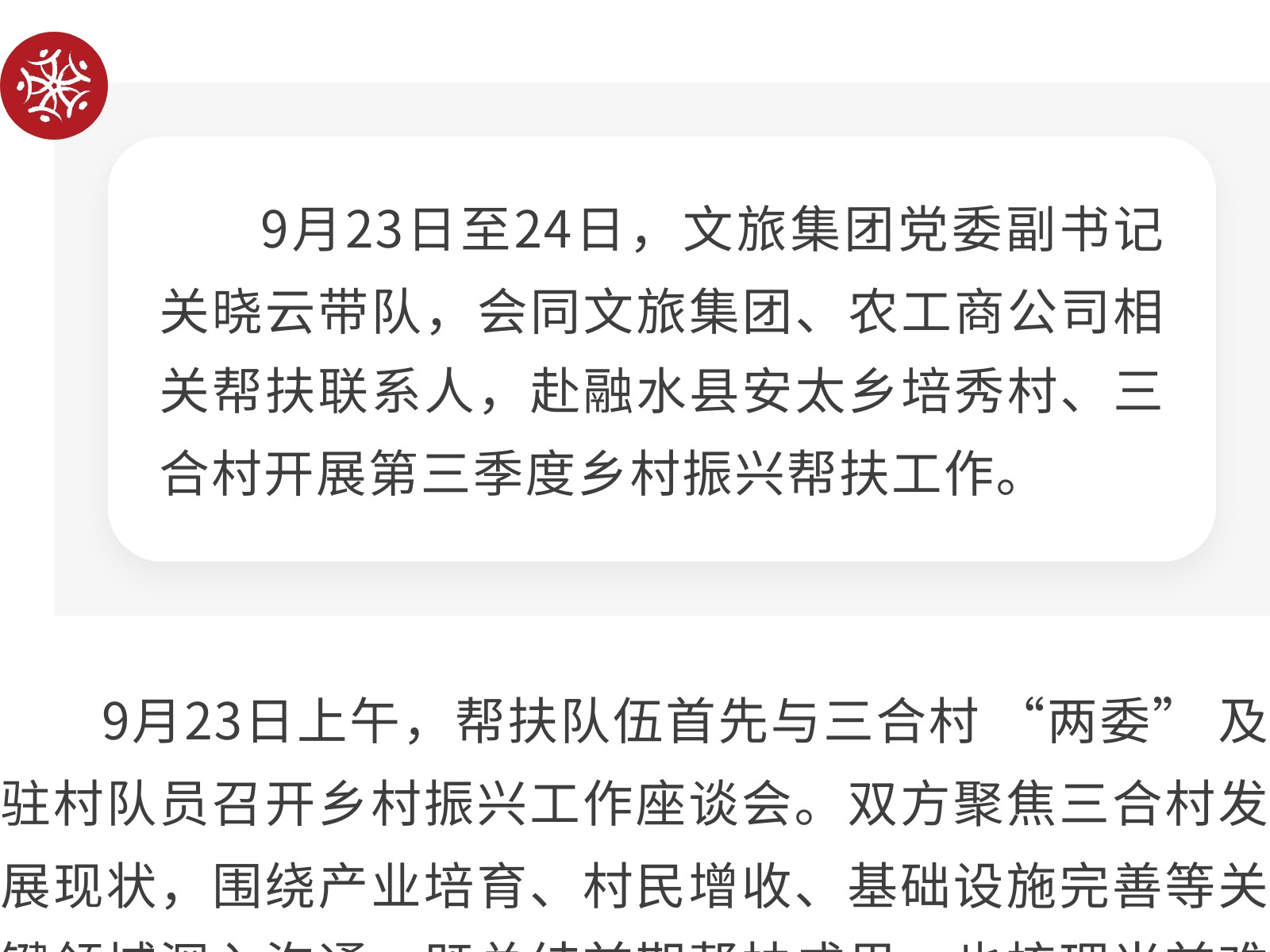 文旅集團(tuán)開展2025年第三季度鄉(xiāng)村振興幫扶活動 發(fā)布時(shí)間:2025年09月30日 16時(shí)來源:本站原創(chuàng)瀏覽:168 人次