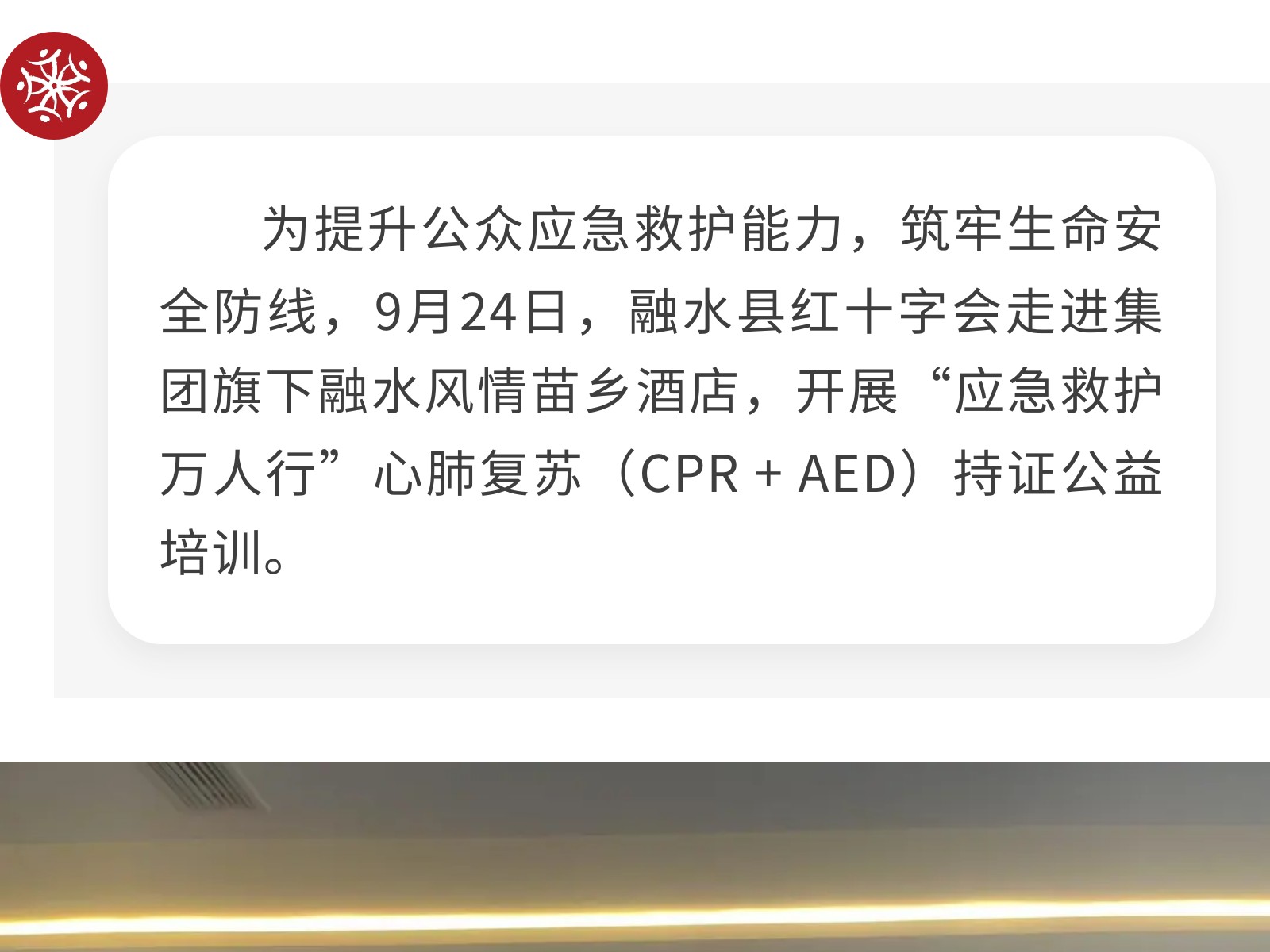 融水縣紅十字會(huì)到集團(tuán)旗下融水風(fēng)苗鄉(xiāng)酒店開(kāi)展“應(yīng)急救護(hù)萬(wàn)人行”心肺復(fù)蘇持證公益培訓(xùn) 發(fā)布時(shí)間:2025年10月14日 15時(shí)來(lái)源:本站原創(chuàng)瀏覽:131 人次