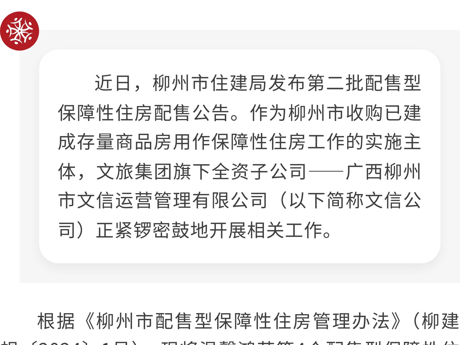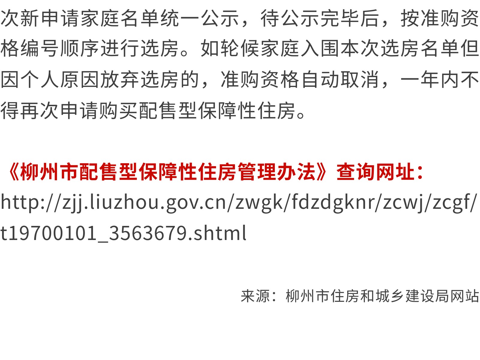 柳州市第二批配售型保障性住房配售公告 發(fā)布時間:2025年11月08日 11時來源:本站原創(chuàng)瀏覽:147 人次
