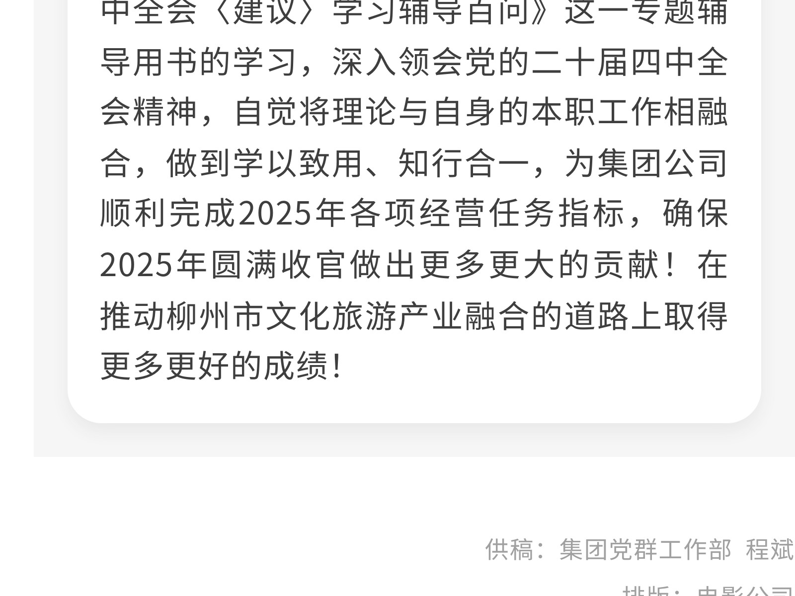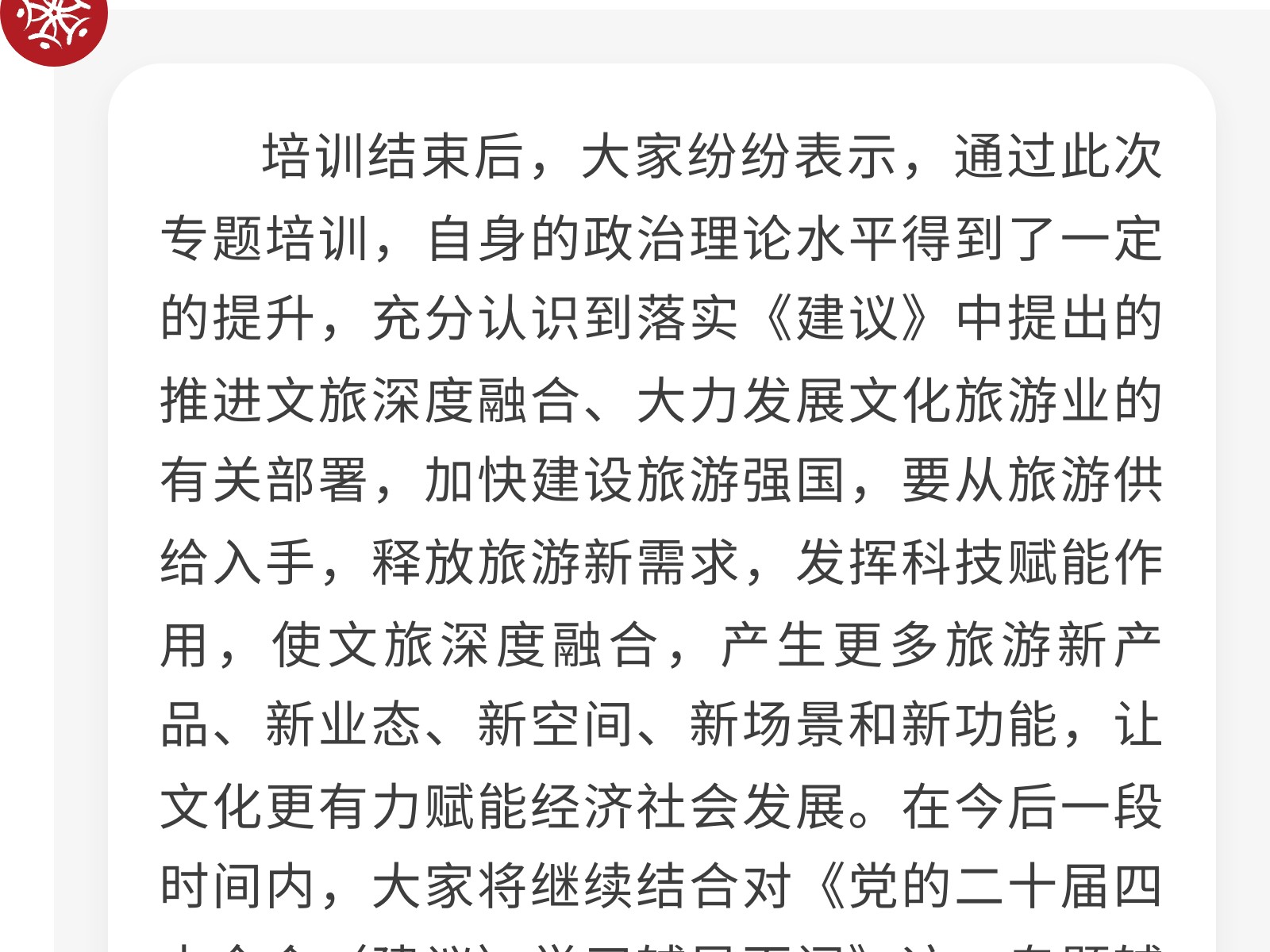 【文旅講堂】文旅集團(tuán)黨委開(kāi)展學(xué)習(xí)宣傳貫徹黨的二十屆四中全會(huì)精神專(zhuān)題輔導(dǎo)培訓(xùn) 發(fā)布時(shí)間:2025年11月25日 16時(shí)來(lái)源:本站原創(chuàng)瀏覽:61 人次