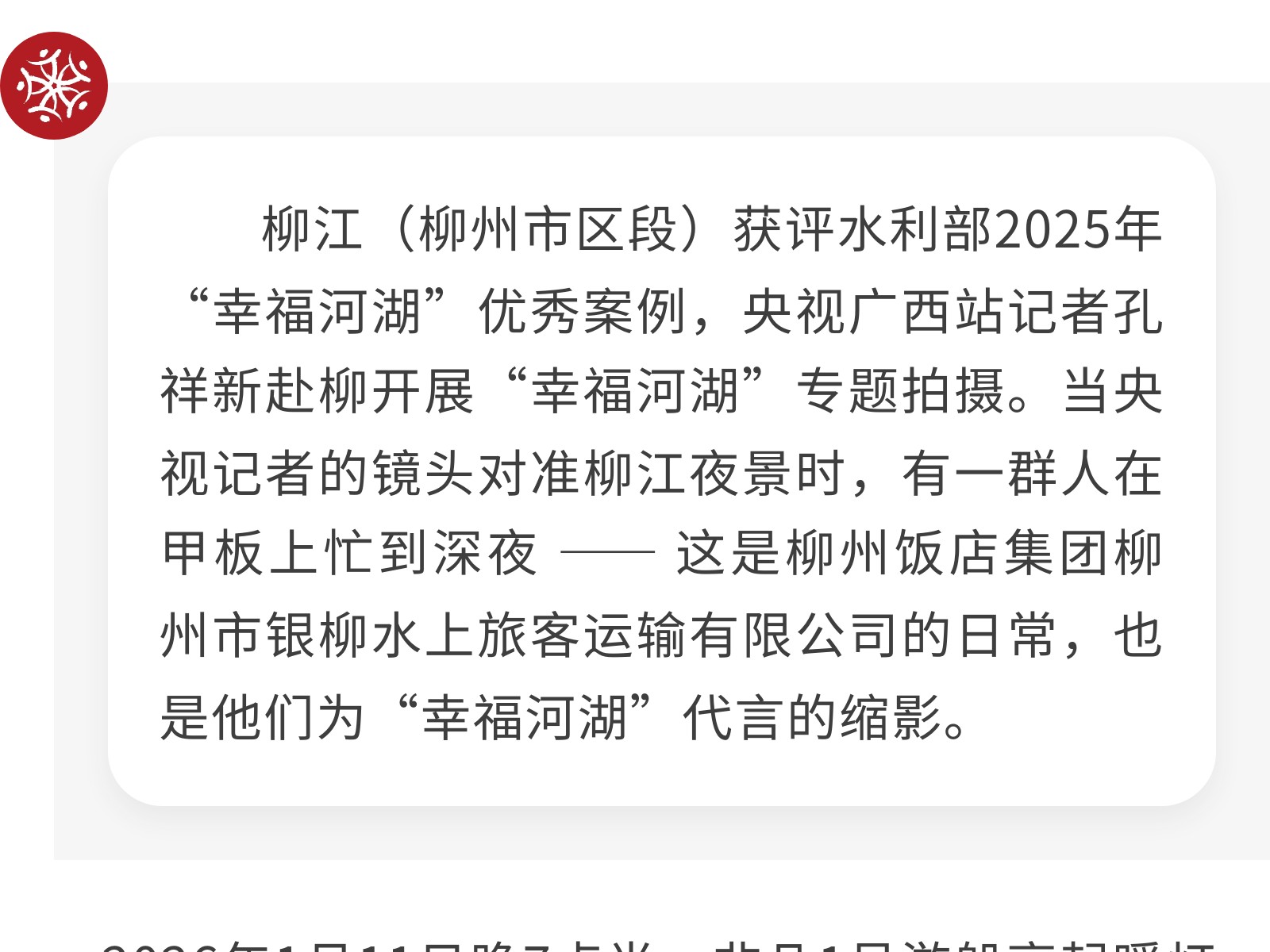 央視鏡頭柳江美,銀柳水上暖心扉 發(fā)布時(shí)間:2026年02月06日 13時(shí)來源:本站原創(chuàng)瀏覽:14 人次