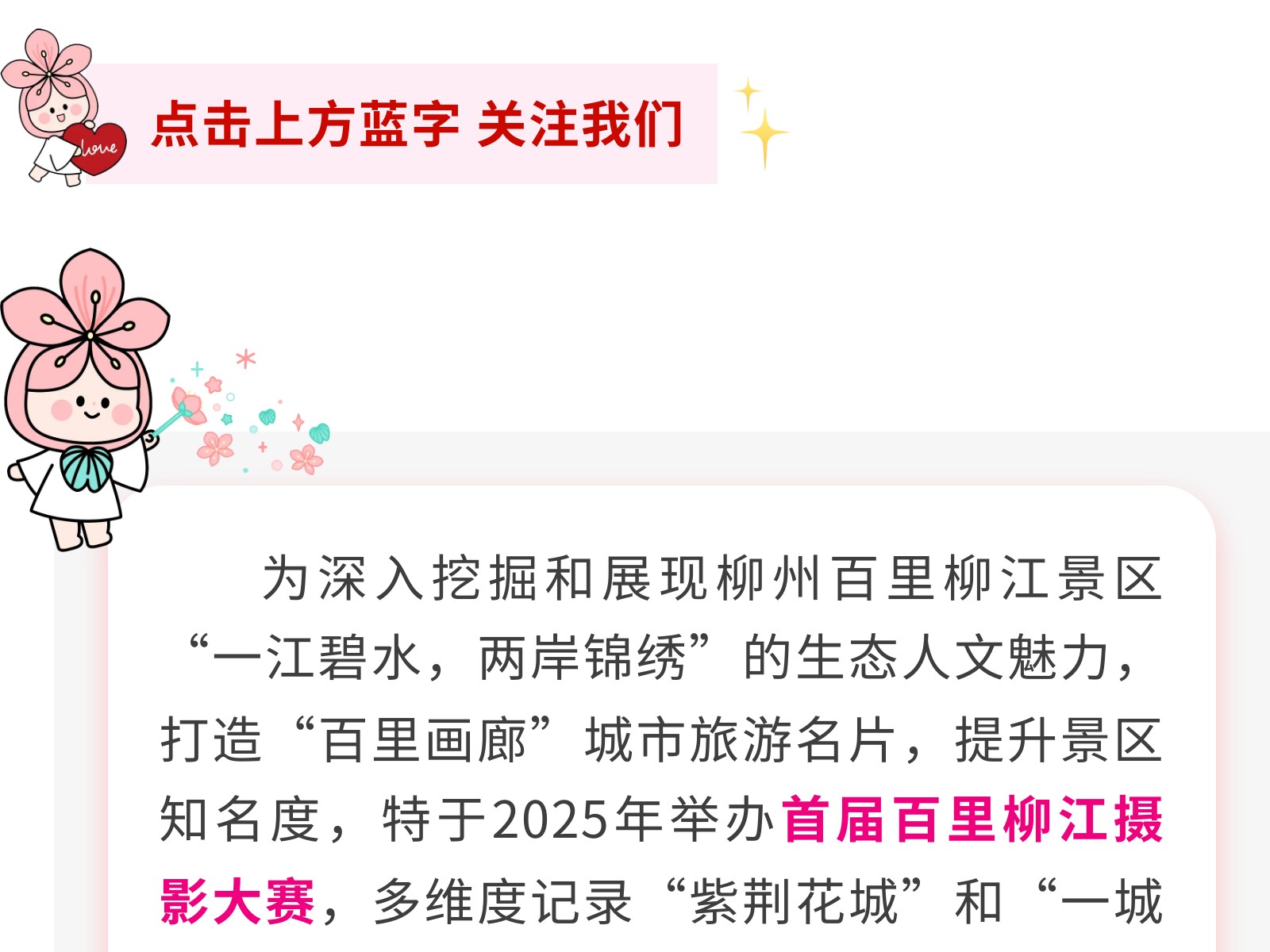 定格最美柳江!首屆“百里柳江”攝影大賽火熱征集中,邀你共賞百里畫廊! 發(fā)布時間:2025年04月26日 16時來源:本站原創(chuàng)瀏覽:98 人次